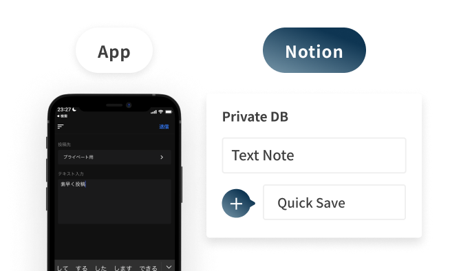 Depending on the page linkage settings with Notion, you can take notes in a variety of formats, including regular text, ToDo blocks, and posting to databases. Multiple pages can be registered, so you can separate your private notes from your work notes.